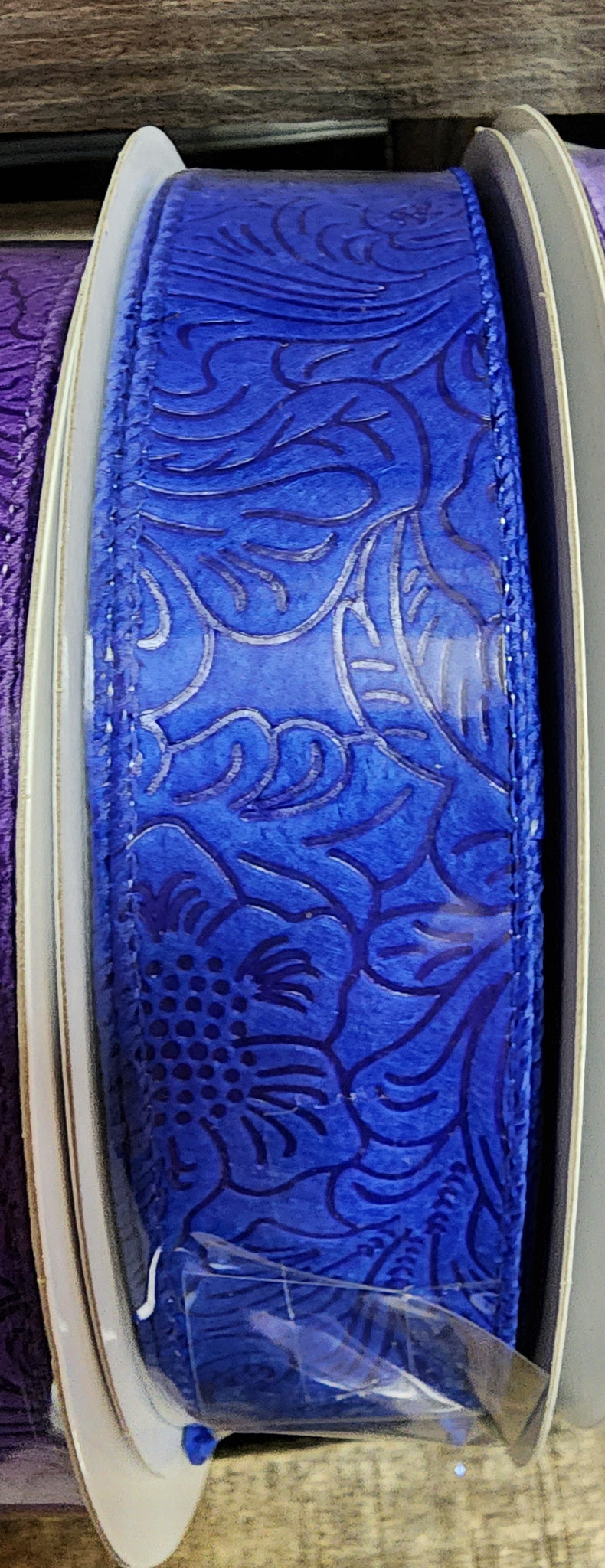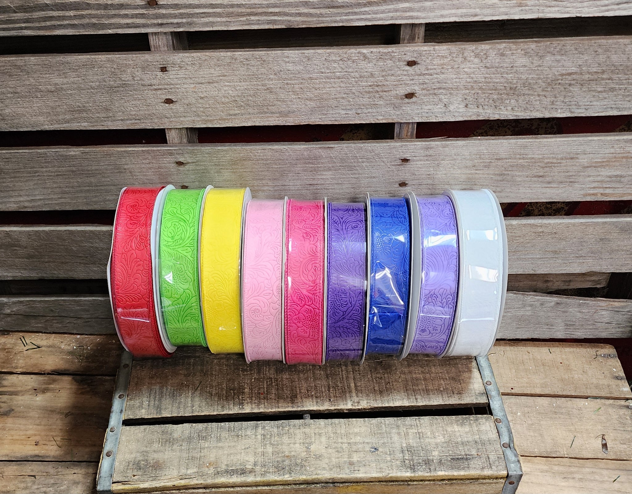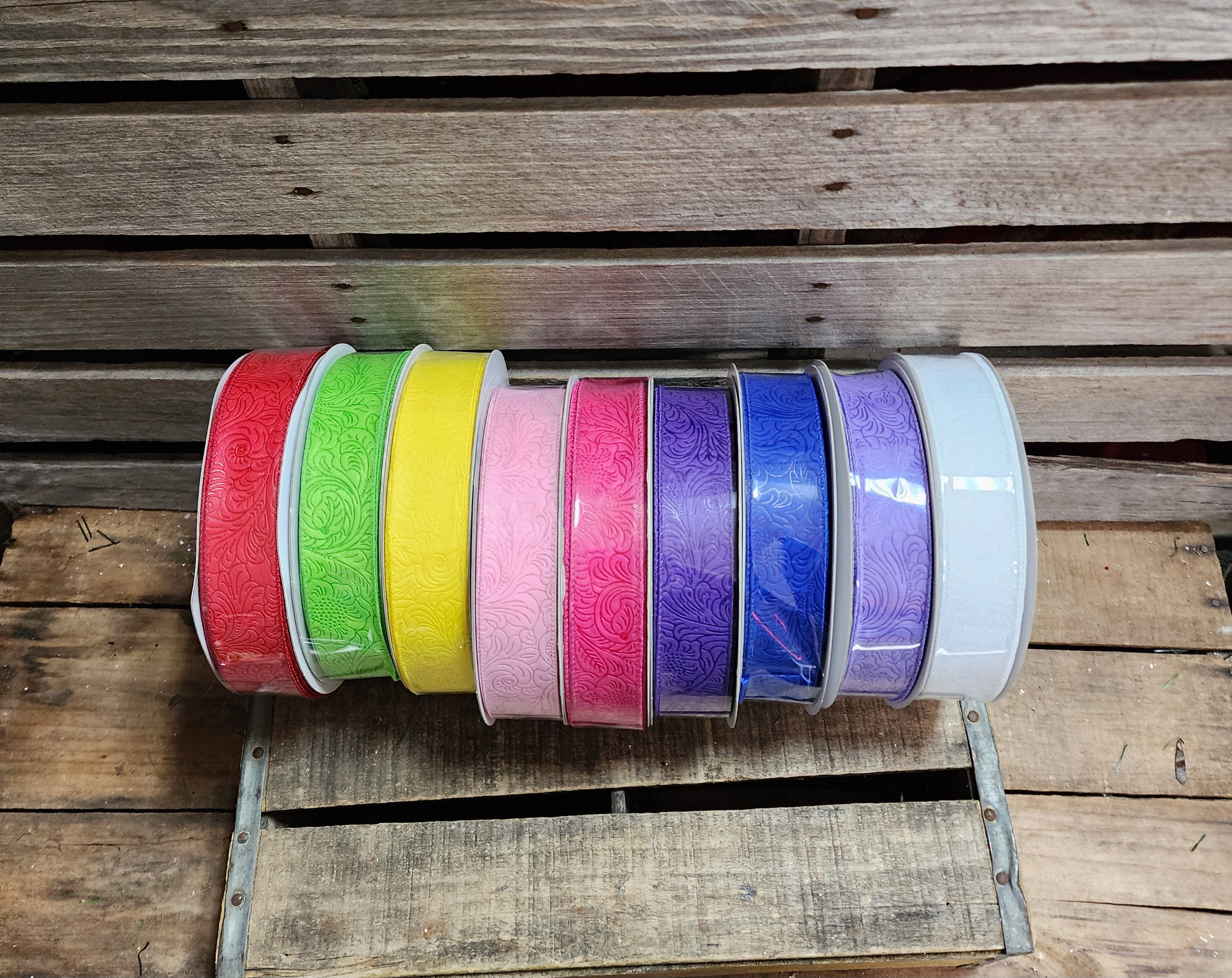 This is a 1.5" embossed Wired ribbon we carry in several colors. These are great for making bows. These are 50yd rolls you can pick the color.