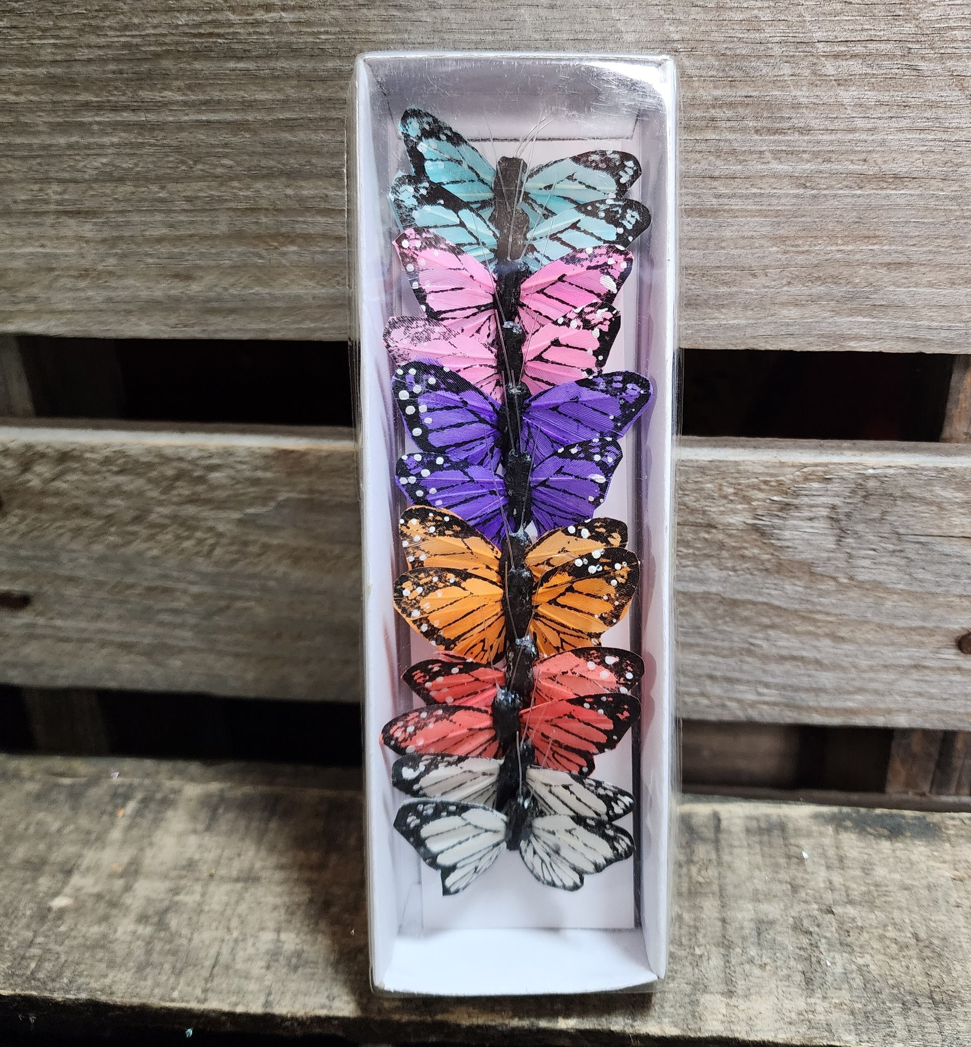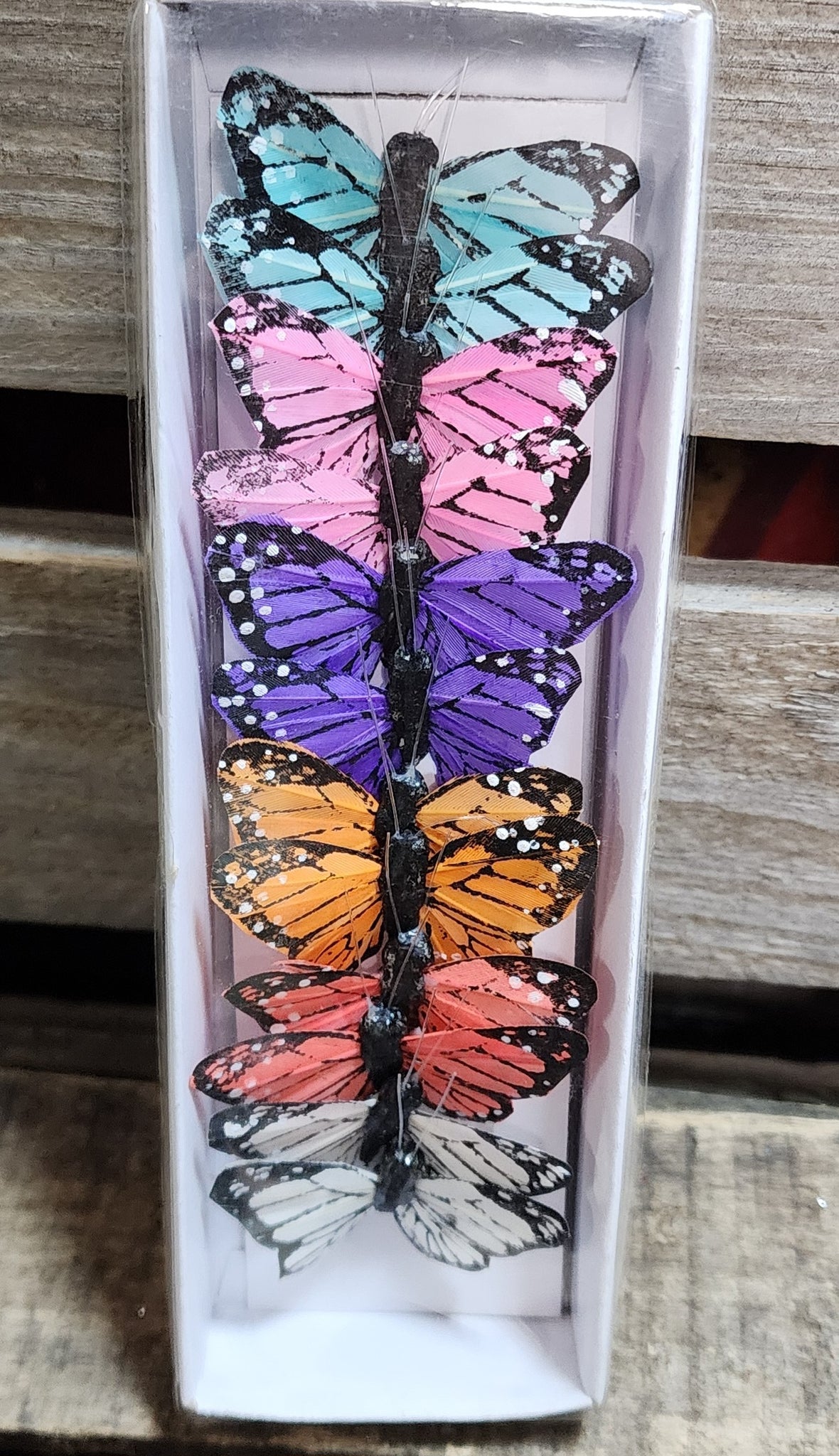 This is a set of 12 monarch butterflies made of feathers and they are about 2" wide in pastel colors and made of feathers