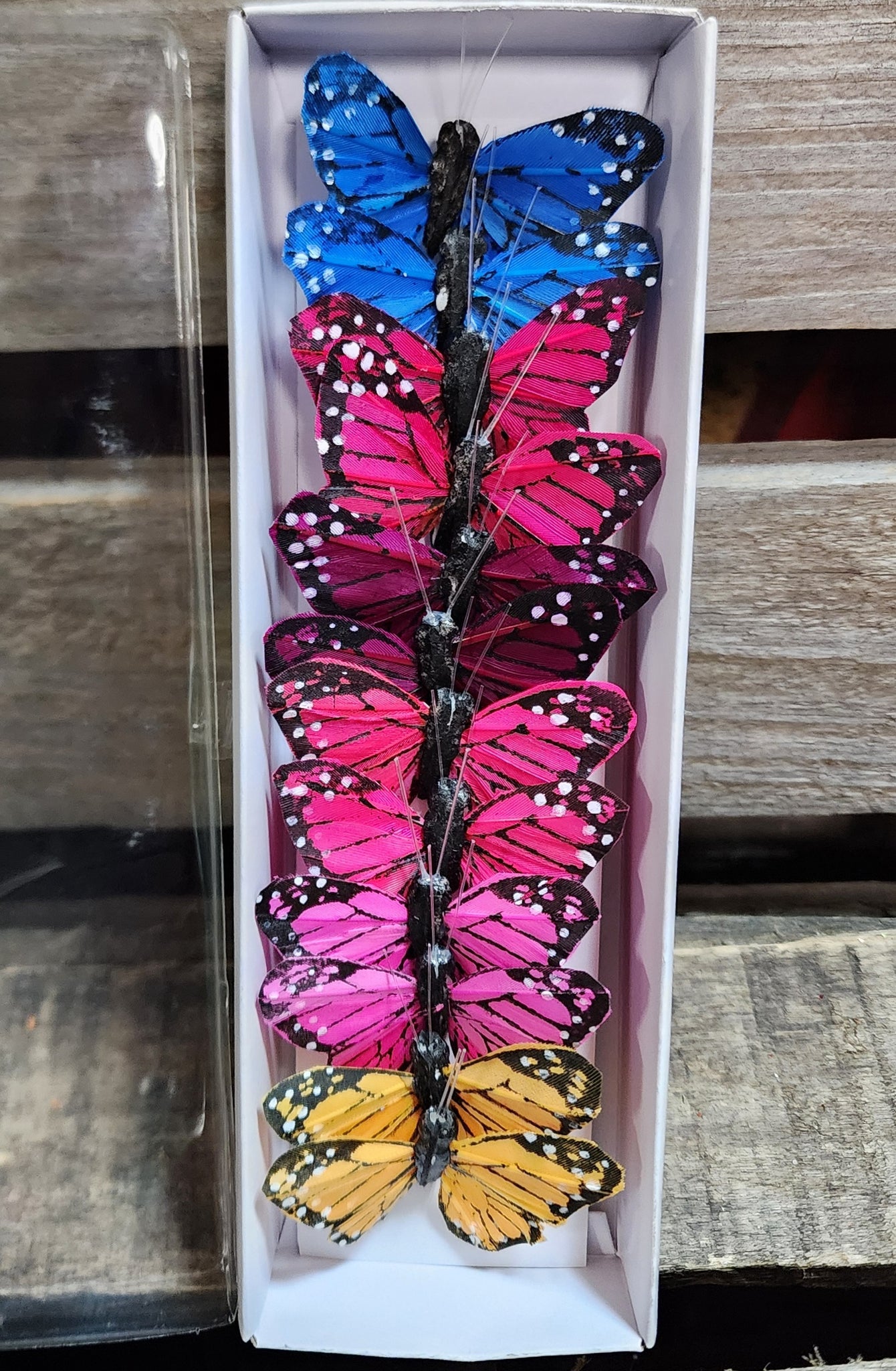 This is a dozen 2" bold color faux monarch butterflies. These work great for photo shoots, arrangements, wreaths and home decor.