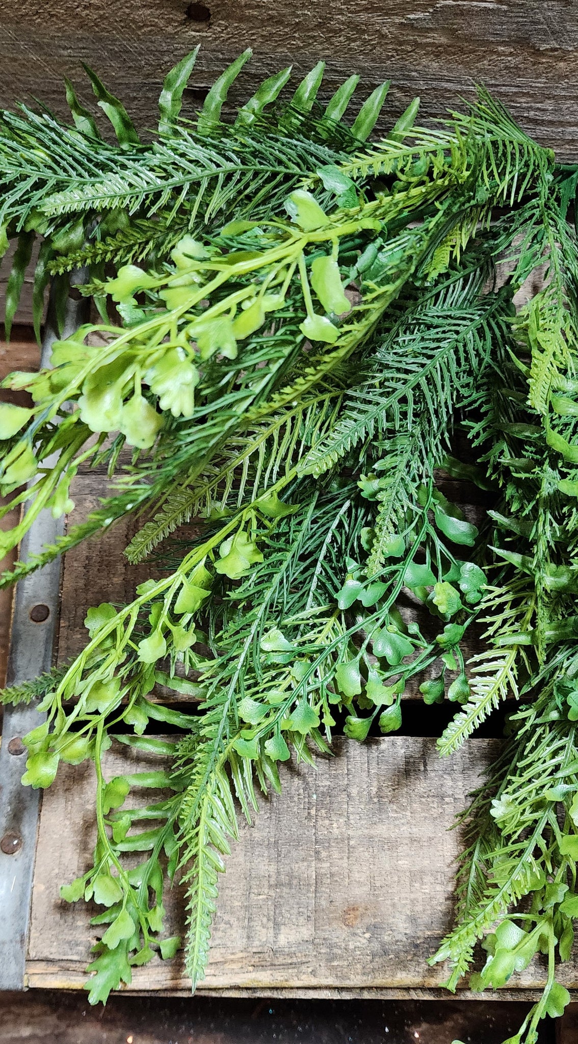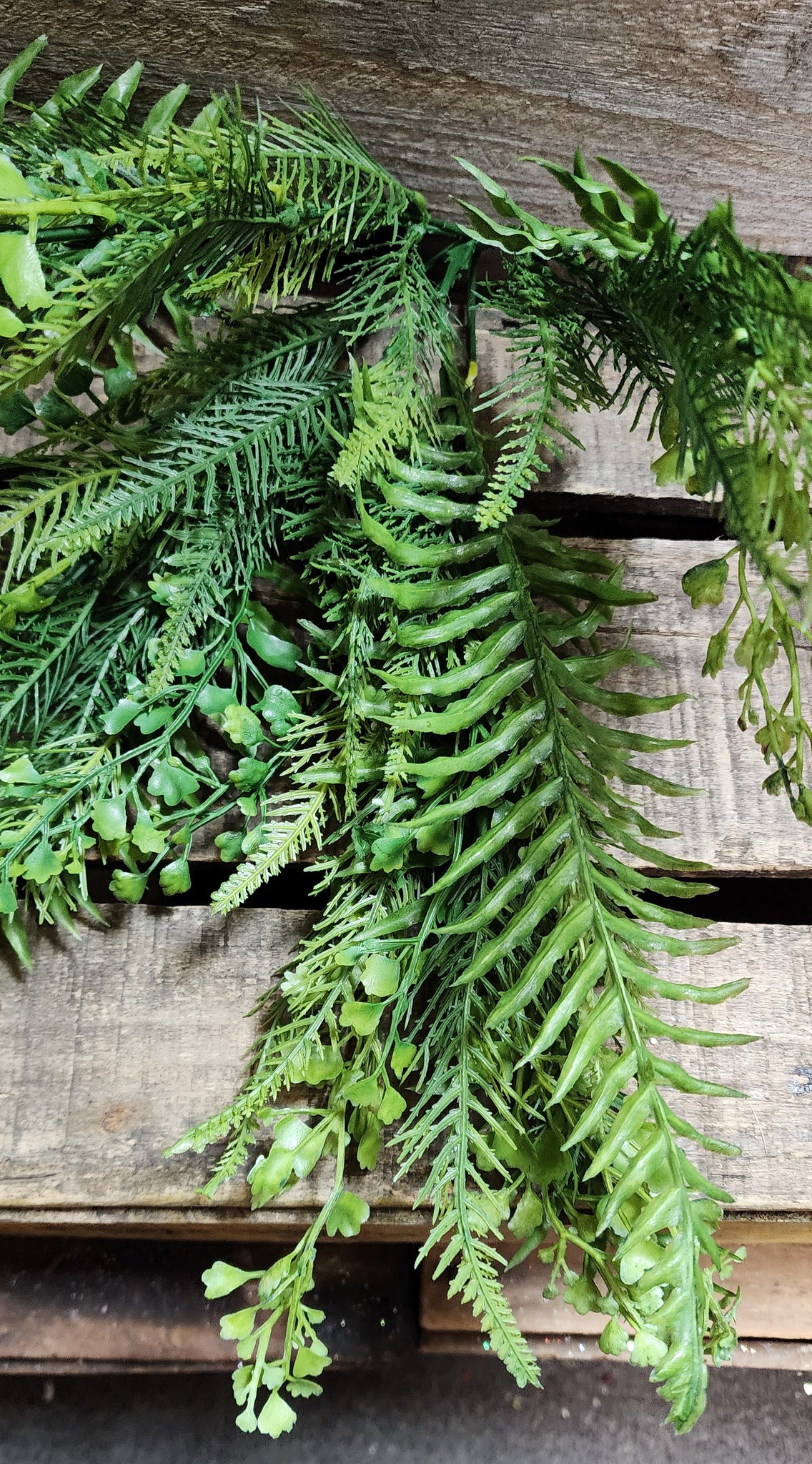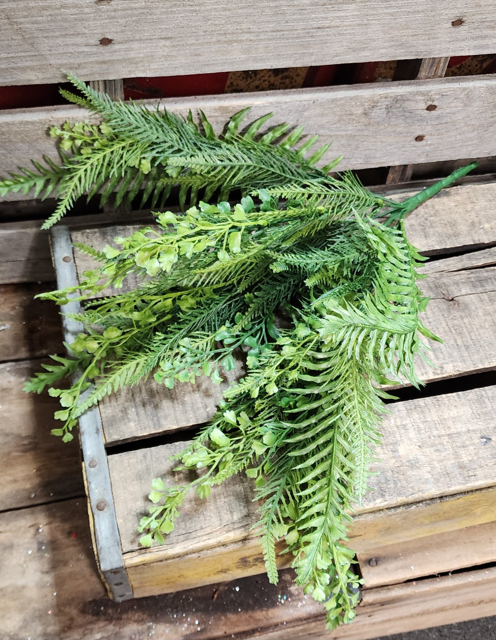This is a plastic mixed fern bush works great for outdoor wreaths and decor.