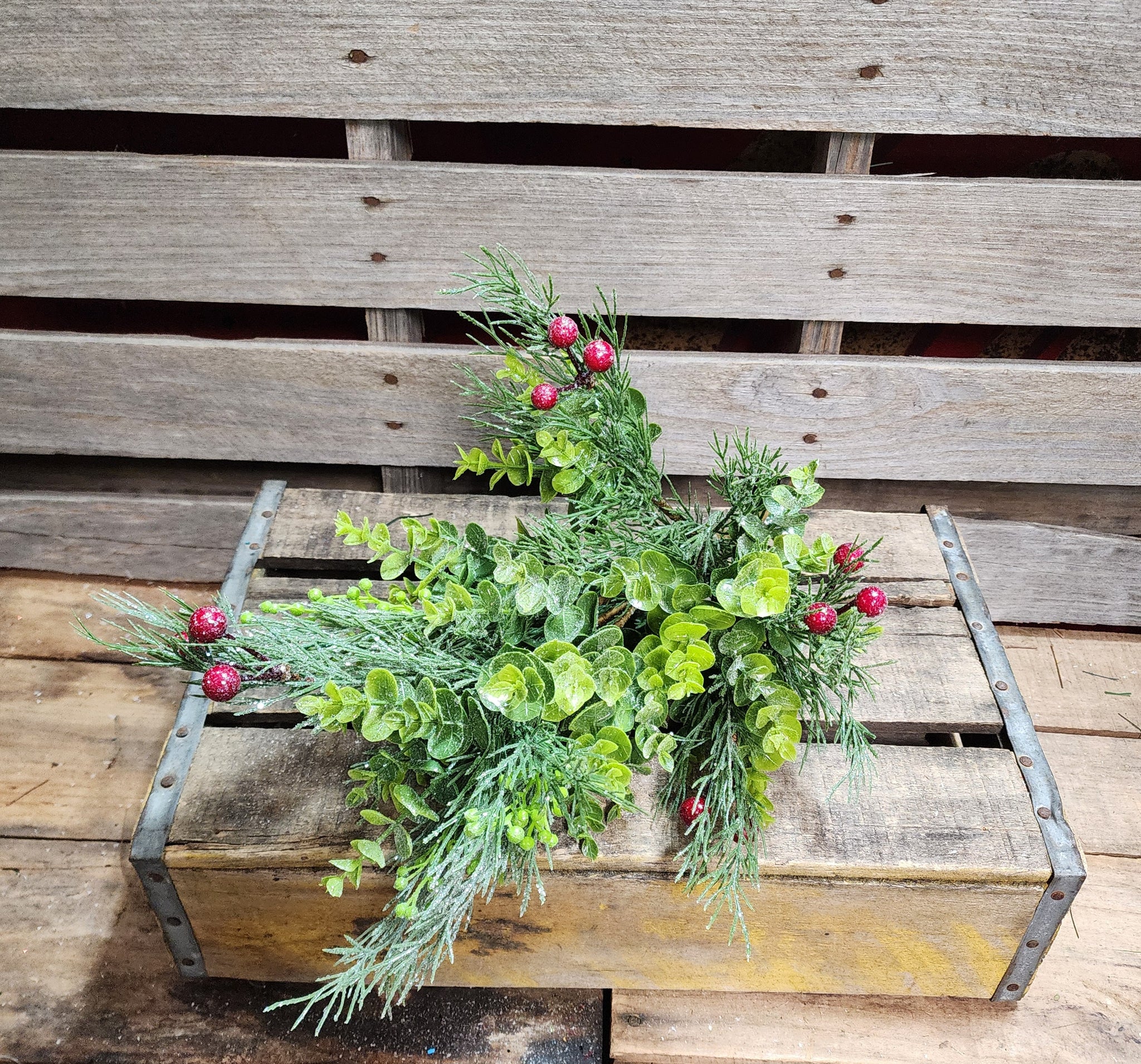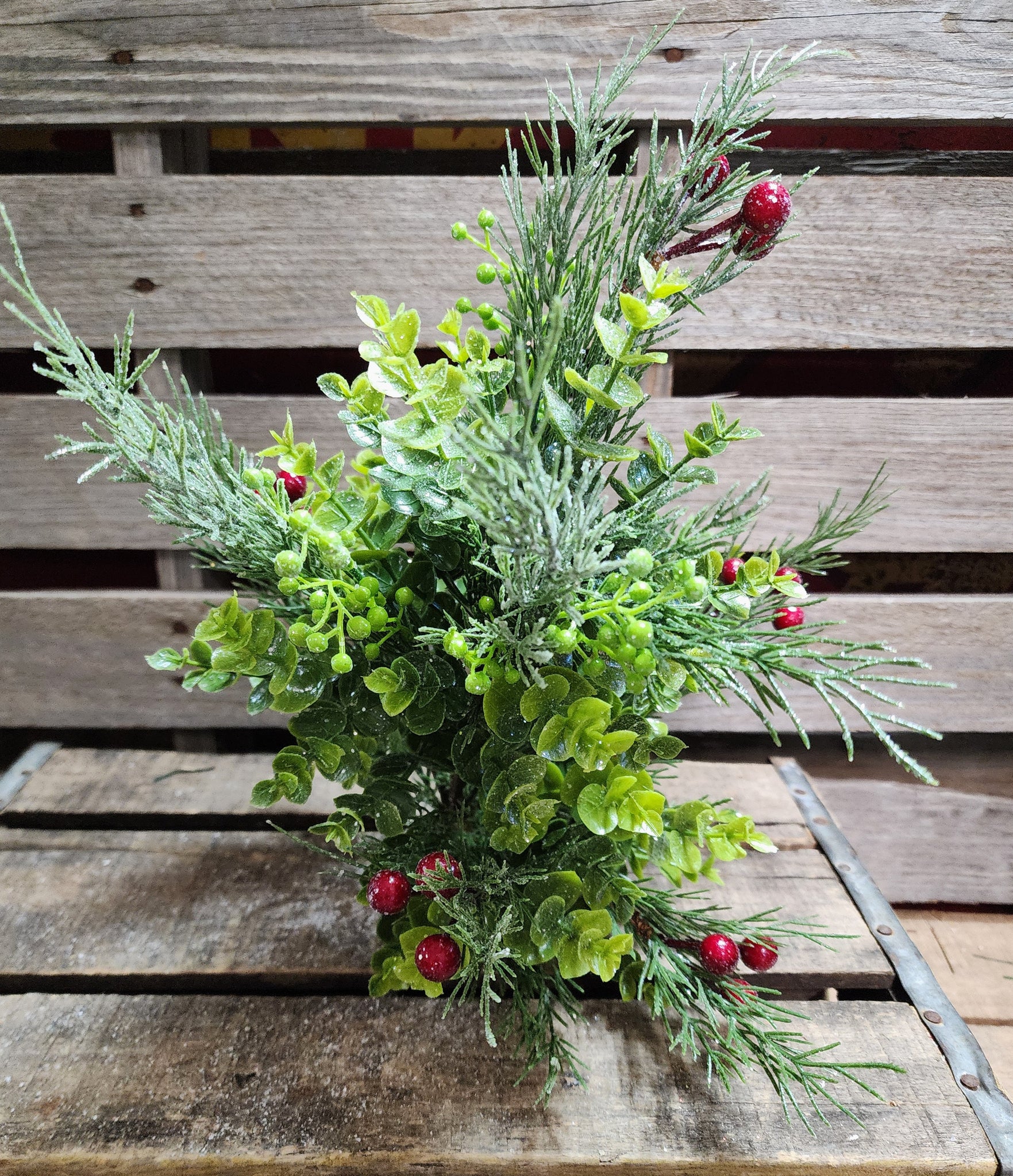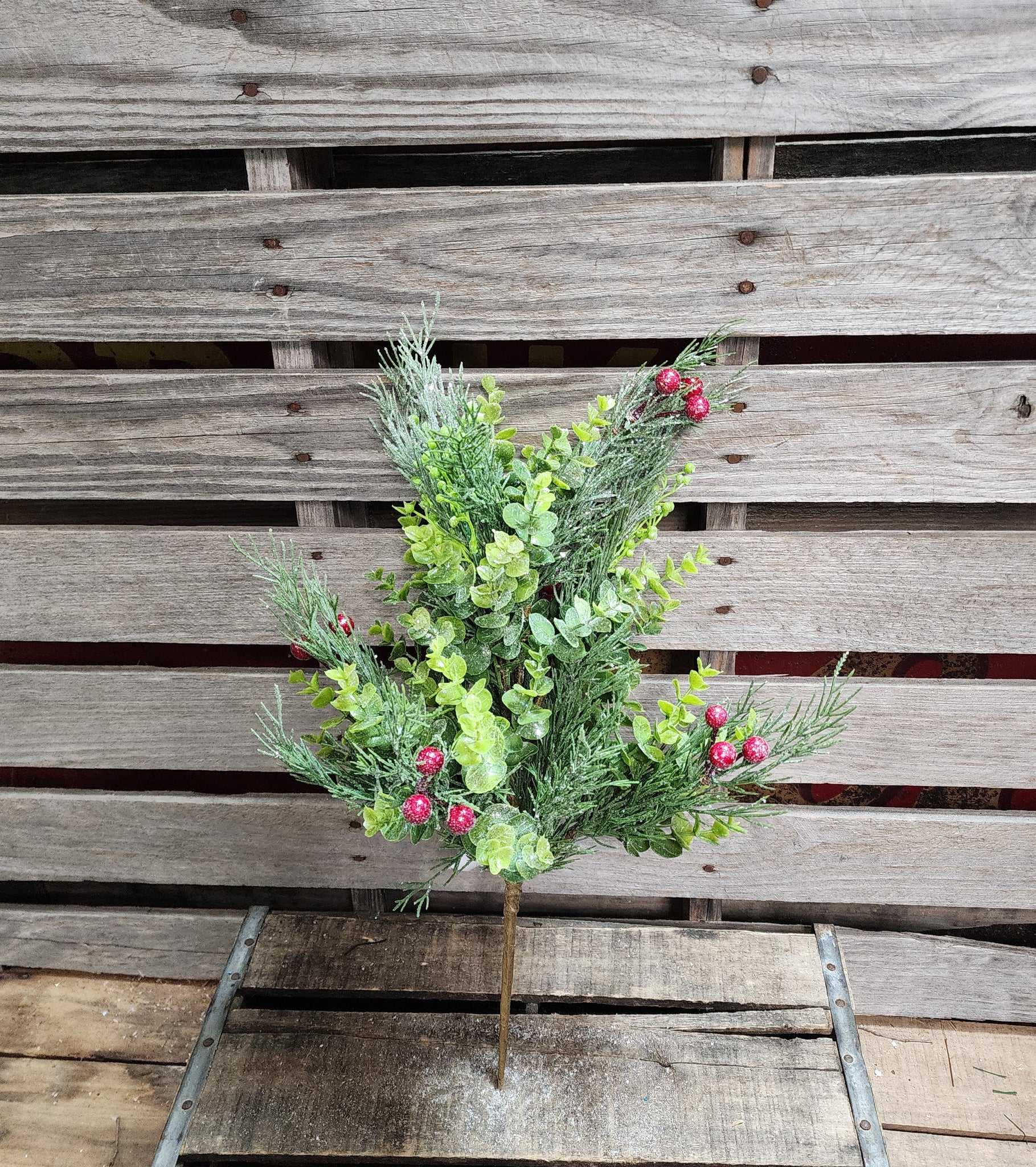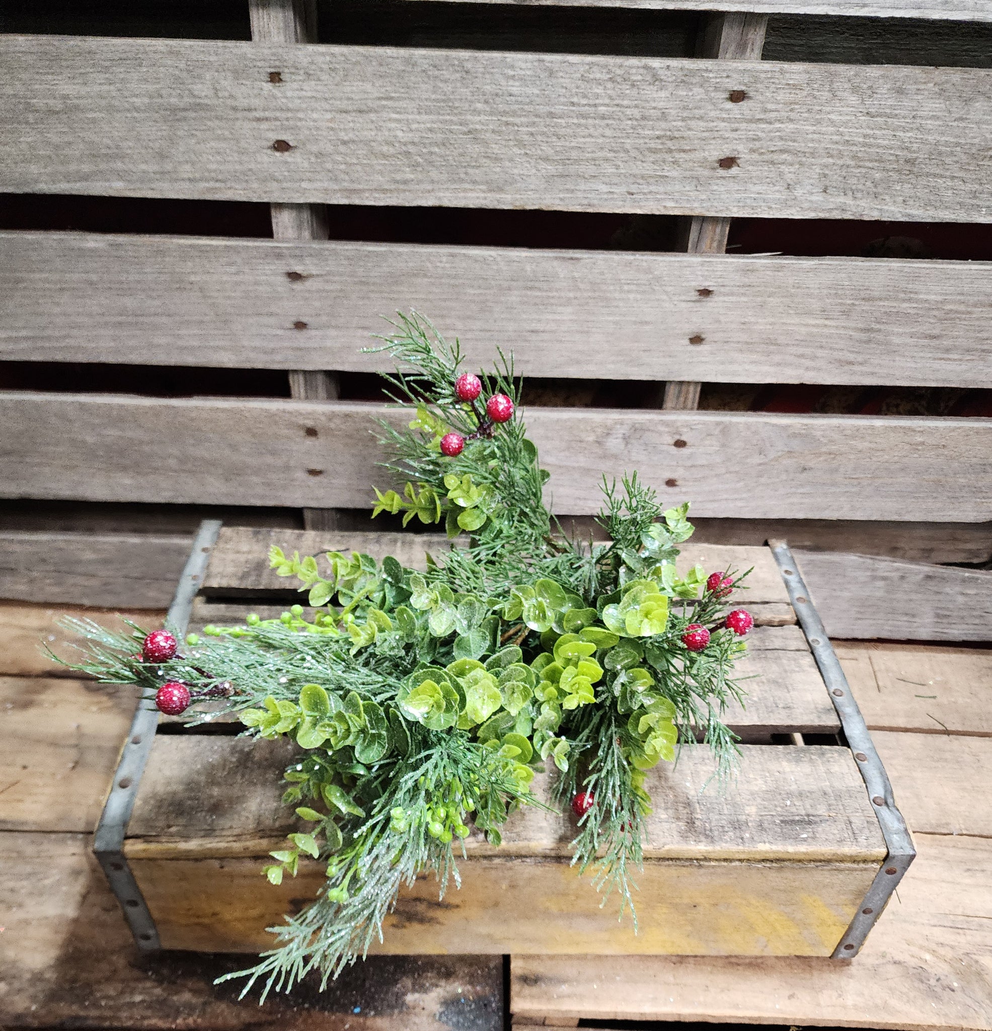 This bush is full of Glittered mixed greenery. It is plastic and would be great for outdoor use. It has eucalyptus, juniper and berries.
