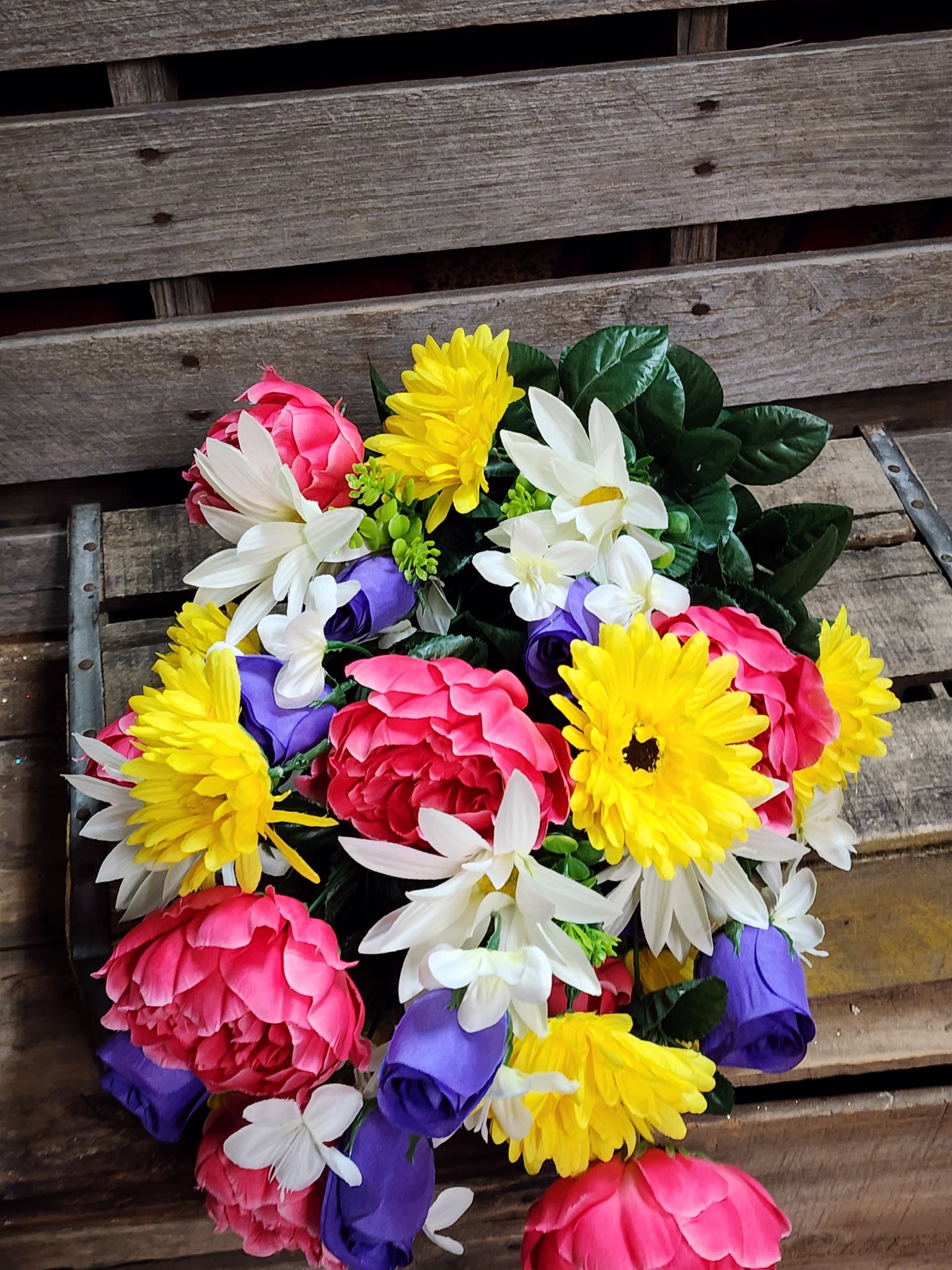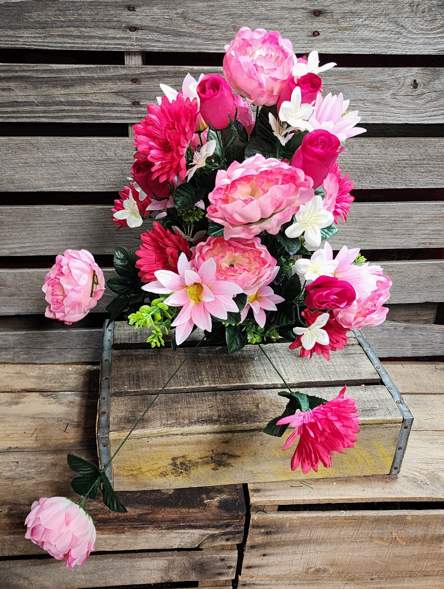 This is a large silk bush with peonies, gerbera daisies and roses it has 36 heads on the bush. This bush comes in 2 colors a hotpink/pink or yellow/pink/purple. This bush works great for making wreaths and arrangements.