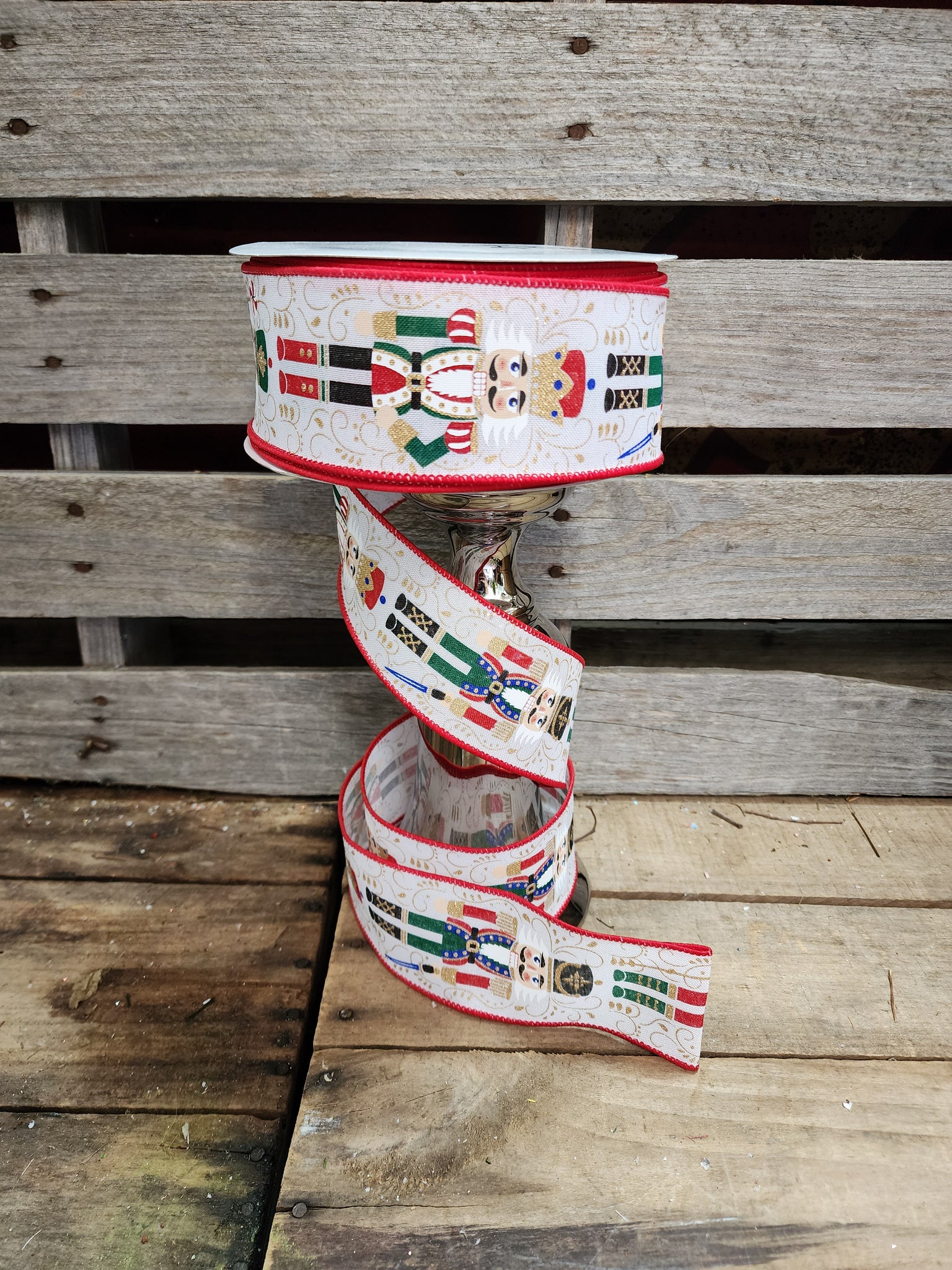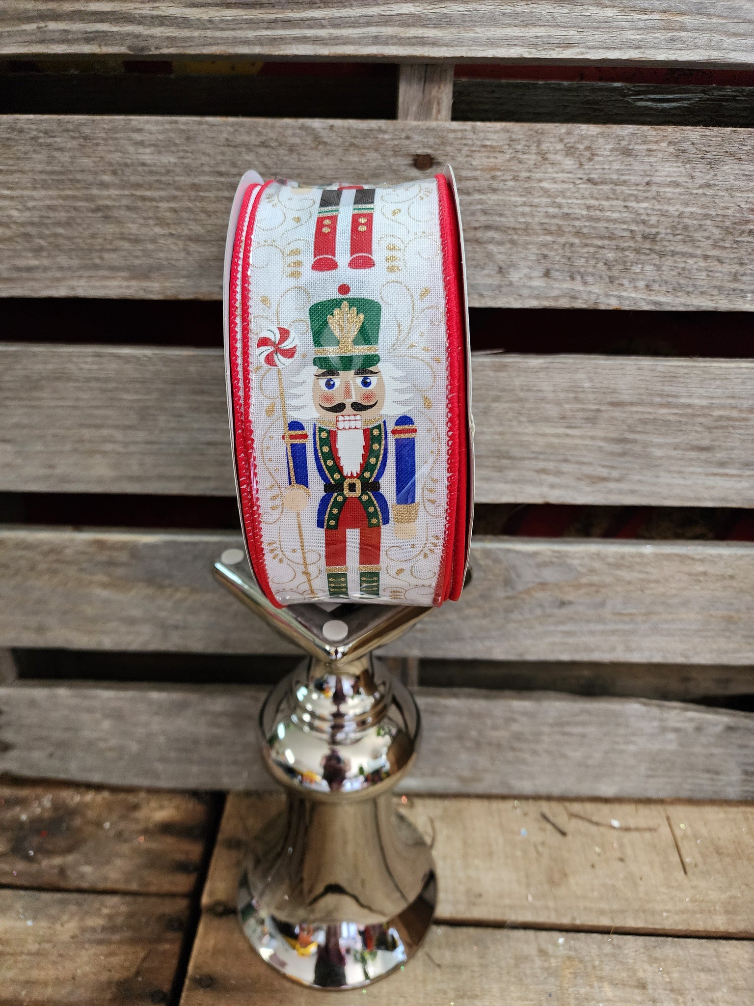 This is a roll of wired ribbon that is linen and printed with nutcracker. This is a roll of 100 ft of ribbon.